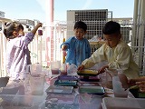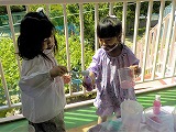 年少児さくら組の子どもたちが,初めての色水遊びを楽しみました。自分の色水をつくることがうれしくて,「こんな色できた!」「紫色にしたい!」「桃のジュースやで」と自分なりに発見したり試したりしながら遊びました。積み木でおうちをつくっていた友達も,「ぶどうジュースくださーい」とやってきて,ジュース屋さんのやりとりを楽しむうちに,「やってみたい」と言って一緒に色水遊びを楽しみ始めました。つくった色水を友達同士で分け合ったりする姿も見られました。できたジュースは,容器に入れて大事に残しました。また遊ぼうね。