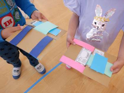 お金を入れたり、バナナや紙人形をつくって入れたり、友達や先生に「見てて」と自分の魔法のさいふを見せて遊びました。
