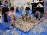 今日は、土粘土をして遊びました。「ぬるぬる〜」足で踏んで「気持ちいい〜!」「お団子できた!」「お山つくろう!」「トンネルができたよ」どんどん遊びが広がり、開放感を味わいながら楽しみました。