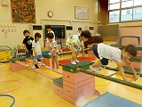 今日は一日中雨降り。砂場は海のよう。子どもたちも「すごいなあ」と驚く姿がありました。室内でも思いきり体を動かして楽しめるように,みんなで遊園地をつくることにしました。年長ゆり組も年少さくら組も一緒に,友達と力を合わせて巧技台を運び,子どもたちがつくりたい遊園地の遊び場をつくりました。はしごを渡る時も,橋を渡る時も,一人一人が自分で考えた渡り方に挑戦しながら楽しむ姿が見られました。片付けもみんなで一緒にやりました。楽しかったね。
