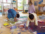 4歳児さくら組の子どもたちが,絵の具のぬるぬるつるつるした感触を手足で味わって楽しみました。バットの中の絵の具を,手や足でぬり広げ,色の変化も楽しみました。紙が破れても大丈夫!思いきり楽しみました。終わった後には,自分で手足を洗い,あったかいシャワーもしてきれいになりました。楽しかったね!
