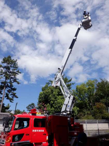 5歳児ゆり組は,右京消防署へ行きました。消防署に着くと,たくさん消防車が停まっていて,はしご車も見せていただきました。