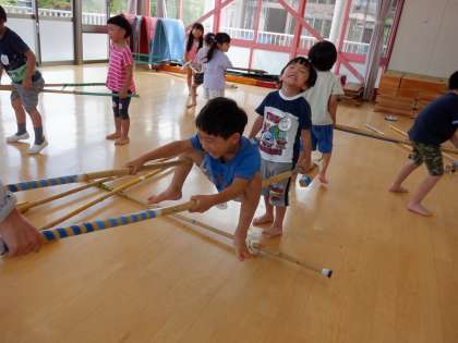 竹馬で何ができるかを楽しんでいるゆり組の子どもたち。今日は,竹馬にまたがり「持って!」と友達に言っている子どもがいました。「おみこしみたい!」と,3人一組で「わっしょい!わっしょい!」とおみこしのように乗って遊びました。重いからと,急におろすと乗っている友達がびっくりするので,友達のことも考えながら…持ち上げる力と,バランスも大事!ちょっと難しいことだったかもしれませんが,子どもたちは,とても楽しんでいましたよ。