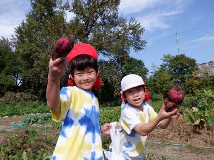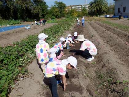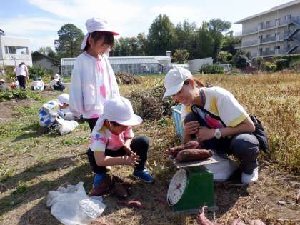 5歳児ゆり組は、京都教育大学環境教育実践センターに、さつまいも掘りに出かけました。畑には、さつまいもが顔を出していて、子どもたちは、ワクワク!!「よーし!掘るぞ!」と土をかき分け、一生懸命掘ると、大きなおいもがたくさん!!くねっと曲がって面白い形のさつまいもも出てきて大喜びでした。1キロずつ測って、お土産に持って帰りました。