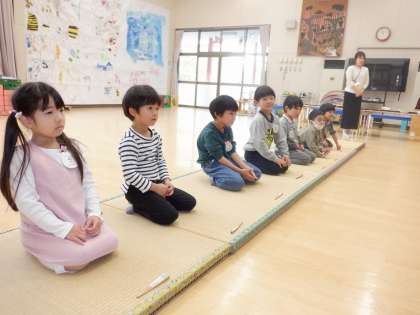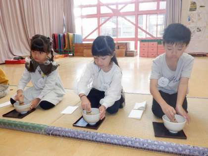 今日は,茶道体験があり,5歳児ゆり組が参加しました。子どもたちは初め,「お抹茶って苦いかな?」「どんなことするんやろう?」と,ドキドキしている姿も見られました。畳の上で正座をすると,背筋がピンと伸びる子どももいました。お作法を,酒井先生に教えてもらい,横の人に「お先に」と言ったり,「どうぞ」の気持ちでお辞儀をしたり,お茶をたてたりしました。お抹茶を残すことなく飲み,「おかわりほしい」「美味しかった」「いいにおいがした」など,五感を研ぎ澄ませ,日本の伝統文化に親しみ,いつもとは少し違う体験ができました。おうちでお話を聞いてみてくださいね。