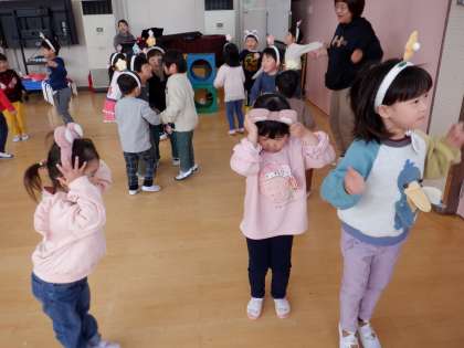 今日は、お別れ会がありました。まずは、ゆり組の保護者の方によるお楽しみでした。クイズやダンスを披露していただき、大盛り上がりでした。次に、みんなで仲良し遊び『友達できちゃった』をしました。手をつないで輪になり、顔を合わせ、笑顔で楽しんでいました。そのあとは、先生たちからのお楽しみで、ピコピコテレパシーをして遊んだり、紙芝居や歌のプレゼントもありました。