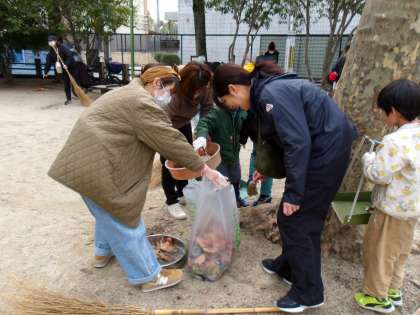 年長児親子と、地域の方々と一緒に、今年度最後の公園清掃をしました。落ち葉やたばこの吸い殻、お菓子のごみなどが落ちていました。ゆり組の子どもたちにとっては、最後の公園清掃なので、張り切って掃除をする姿が見られました。