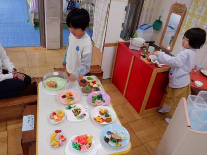 進級して2日目。昨日楽しかったケーキ屋さんをやろう!とさっそくままごとコーナーで遊ぶ子どもたちです。おいしいごちそういっぱいできたよ!