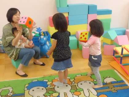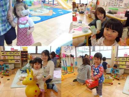 スポンジのさいころを投げてお母さんと一緒に遊んだり,大好きなロディに乗ったり、かわいい箱で遊んだり,みんな好きな遊びを見つけて,のびのびと遊んでいました。