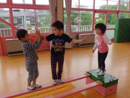 巧技台と滑り台やビームを組み立てて遊び場を作りました。大きなマットも使ってジャンプ台も作っています。自分たちで組み合わせを考え、友達と協力して作りました。
