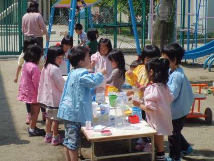 絵の具を水にとかして素敵なジュースつくりです。4歳児も5歳児も一緒になって遊びました。