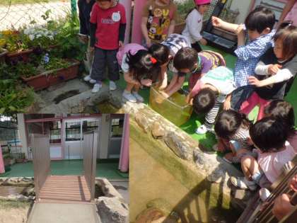 工事のために,金曜日に引越しをした鯉や金魚たちを池に戻し,子どもたちは大喜びです。
