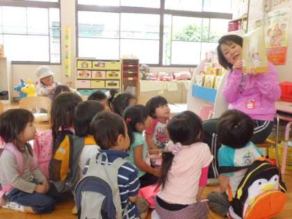 今日は、園庭や保育室でたっぷり遊んでから、紙芝居を見せてもらいました。