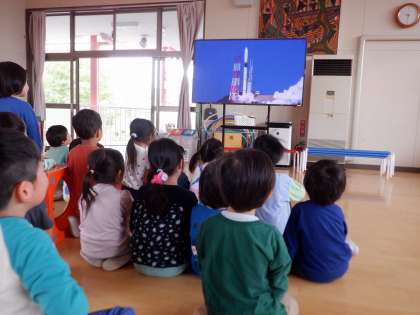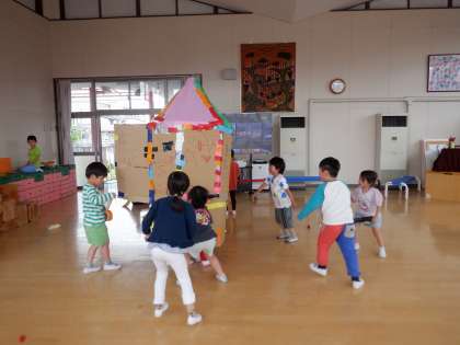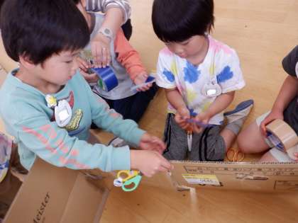 今日、「月に行ってみたいなぁ」と担任がつぶやくと、「ロケットでいけるよ」「ロケットつくろう!」と、ゆり組みんなでつくることにしました。インターネットの動画でロケットが発射する様子やロケットができるまでの様子を見てイメージした後、段ボールを切ったり、ガムテープで貼り付けたり、エンジンやドアをつくったり…みんな大忙しでした。素敵なロケットができ、早速みんなで代わる代わる乗って楽しみました。
