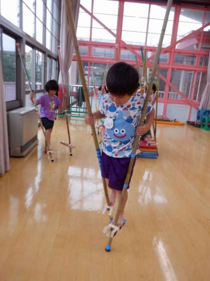 今日は、休日参観で保護者の方と一緒につくった竹馬に、早く乗りたくて、一生懸命取り組む姿が見られました。1歩でも乗れたことを「1歩乗れたね!」と励ますと、「次は2行くで!」と、意気込んで何度も取り組みました。