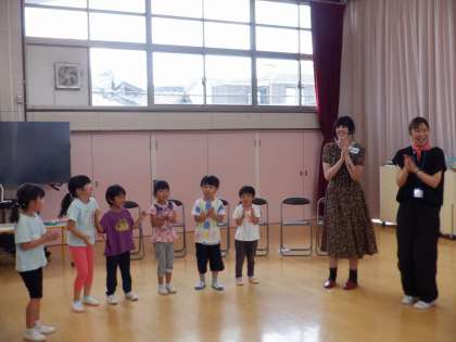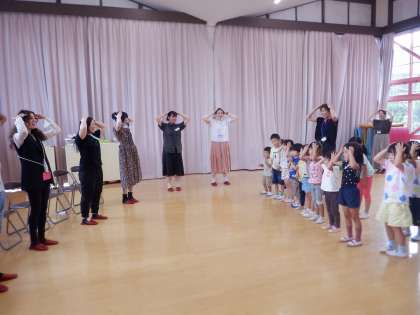 今日の預かり保育は、『英語で遊ぼう』でした。教育委員会よりALTの先生方が来てくださり、子どもたちに英語で自己紹介をしたり、絵本を読んだりしてくださいました。一緒に『あたま かた ひざ ぽん』や『ホーキーポーキーダンス』を英語で歌って踊ったり、6つのグループに分かれてカードゲームや電車ごっこ等も一緒に遊んだりしました。