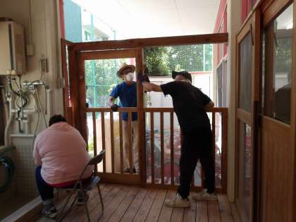 右京区内の小学校中学校幼稚園の管理用務員さんにお世話になり、園舎のテラスを修繕していただいています。