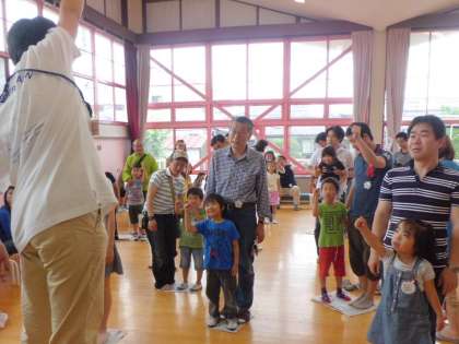 次は新聞紙のりじゃんけんゲームです。先生とじゃんけんをしてまけたら、今乗っていている新聞紙を半分に折ってその上にお家の人と一緒にのるというゲームです。折って折って小さくなった新聞紙にお家の人とのるのはとってもうれしくて楽しいですね。