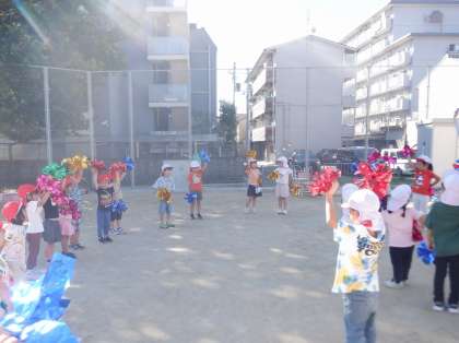 キラキラのポンポンを持って踊る姿を見てきた年少さくら組の子どもたちに、ゆり組さんが一緒に踊って教えてくれました。向かい合って踊ってもらって大喜びの子どもたち。音楽を用意するとさくら組でもダンスが始まりました。自分たちもできてうれしいね!