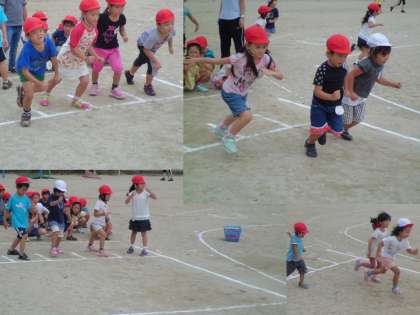 今日は小学校が運動会の代休日で運動場をお借りすることができました。みんなは広い運動場で入場行進の練習をしました。音楽に合わせてかっこよく歩いていました。次に「夢をかなえてどらえもん」のみんなのよく知っている曲で大きな声で歌を歌いながら楽しそうに体操をしていました。かけっこは,一緒に走りたい友達を見つけて,広いコ−スを力いっぱい走りました。