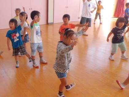 全園児で「バナナの森のピクニック」を踊りました。素敵なポ−ズをきめて楽しんでいます。