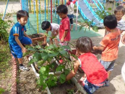 なすびやピーマンの収穫を終え、次に植えられるように準備をしました。4歳児は今日はピーマンなど素敵なお土産を持って帰りました。
