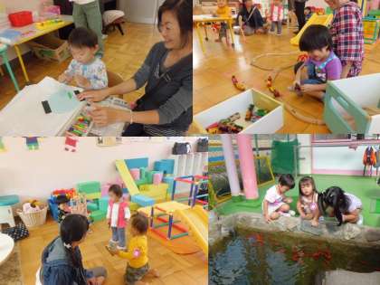 毎週水曜日は教育相談「ひよこ組(0歳児〜3歳児)」の日です。今日もいい天気でたくさんの親子が遊びに来てくれました。貼り絵をしたり,汽車のおもちゃを組み立てて遊んだり,砂場では,大きな山や川をつくって遊んでいる子どもたちもいました。人気NO1は,金魚の餌やりです。いっぱい遊んだ後は,「むすんでひらいて」の曲を先生と一緒に歌ったり手遊びを楽しみました。10月20日(土)は西院幼稚園の運動会です。遊びに来てくださいね。