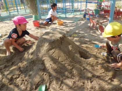 いちご組は,砂遊び中!!友達と一緒に大きな山をつくって,トンネルも掘りました。こてを使って山をしっかりかためてこわれないように,ていねいにつくっています。