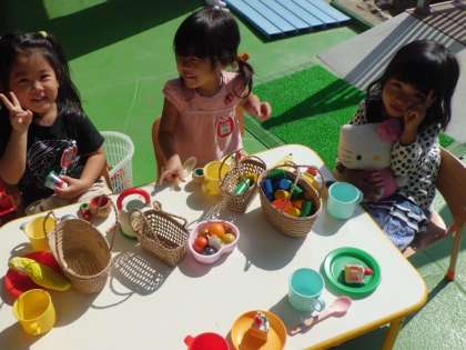 今日はとてもいい天気!保育室前のテラスにテーブルをおいて友達と一緒に仲良くテレビごっこをしています。ごちそうをいっぱい並べて楽しくごっこ遊びをしていました。