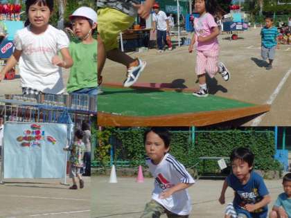 次は4歳児の「森へピクニックにいこう」です。友達と一緒に乗り物や動物になって遊んだり,みんなで楽しく踊ったりしました。5歳児の「31ぴきのねこのうんどうかい」では,海でおさかなをつかまえて食べてしまうまでの内容を考え,一つの競技にしました。「ごろごろごろにゃぁ〜ん!」と言って猫になりきってスタートです!未就園児のひよこ組「よーいどん!」では、いつも踊っている「どうぶつ体操」を在園児の子どもたちと一緒に踊って楽しみました。