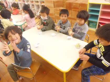 今日はみんなでスィートポテト作り。幼稚園で育てたさつまいもを切ってふかして牛乳とバターを入れてこねています。「こねこねすると楽しいね」と言って年長組の子どもたちが作っているところを見せてくれました。砂糖を入れなくてもとっても甘いさつまいもでした。