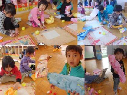 4歳児は紙を張り合わせて鳥の体を作っています。紙をのりで張り合わせていくのは根気の要る作業ですが、出来上がるとうれしくて「見て!見て!」といって見せに来てくれました。