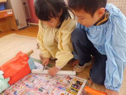 5歳児は友達と2人組で猫を作っています。互いに相談していい感じで協力しあって作っている姿が見られます。