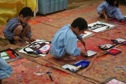 今日はさくら組(年少児)の子どもたちがトロッコ遠足を思い出して絵の具で思い思いに表現を楽しみました。