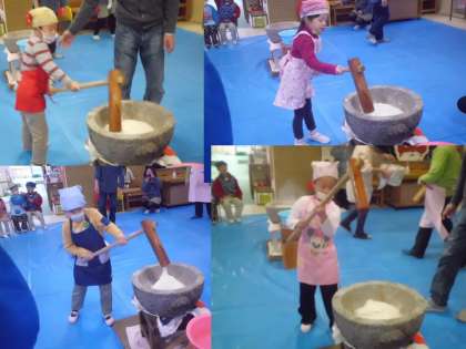 一人できねをしっかりと持って「よいしょ!」とおもちをつくとねばねばおもちが引っ付いて重たくなってもがんばりました。餅とり粉を手につけてくるくるとまるめていきました。おもちをついた後はおいしいお雑煮をいただきました。