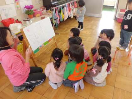 15日(月)のいちご組(3歳児)は,『ねこの歌』で遊びました。先生にお天気のねこの絵をかいてもらって一緒に『ねこの歌』を歌いました。晴れているときは,ねこのしっぽが立っています。くもりのときは木の皮でつめを研いでいます。大きな口をあけて「にゃーご」とねこのなきごえをまねています。
