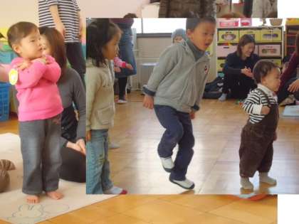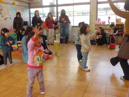 毎週水曜日は教育相談「ひよこ組(0歳児〜3歳児)」の日で,未就園児の子どもたちが親子で遊びに来る日になっています。いっぱい遊んだ後は,いつも絵本の詠み聞かせや唄を歌ったりしています。そして,子どもたちの大好きなどうぶつ体操をして帰ります。年明け久しぶりに参加したお友達も音楽がなると思い出してかわいい体操を始めていました。毎週水曜日9時30分から11時30分まで「ひよこ組」です。遊びに来てくださいね。