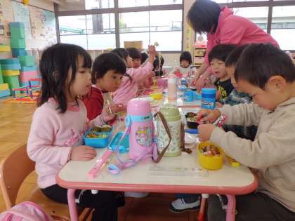 今日のいちご組(3歳児)は,弁当日でした。朝は雪がちらちら降る中,在園児達と一緒に寒さに負けず元気いっぱいマラソンです。体を動かして遊ぶことが好きないちご組の子どもたちは,いつもおなかがぺこぺこ!!お昼のお弁当は楽しみです。「おべんとうおいしい!」「かわいいウサギのおにぎりだよ!」保温機で暖めたホカホカのお弁当を食べて,また元気に遊びました。