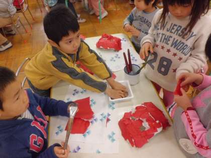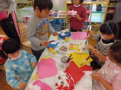 今日は5歳児が鬼のお面をつくりました。筆を使ってお面にのりを塗って和紙を貼り付けています。鬼の表情を考えて,眉毛を黒い色紙で貼って作っています。おそろしい鬼のイメージでなく,みんなかわいい顔の鬼が多かったです。明日は,角をつけたり牙をつけたりするようです。どんな表情の鬼ができるのかな?楽しみですね。