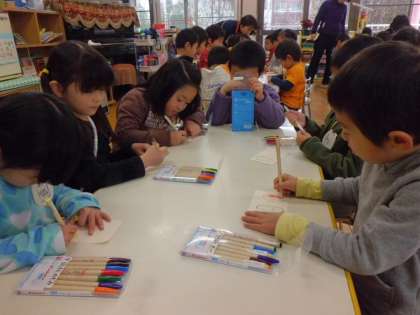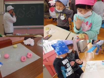 今日は親子で和菓子つくり体験をしました。やわらかい和菓子のうさぎやつばき,すいせんなどをつくりました。かわいく,うつくしく仕上がった和菓子は,とってもおいしかったです。ご指導していただいた萩野先生ありがとうございました。さっそく5歳児がお礼の手紙を書きました。お母さんたちも「もっとつくりたい!」「楽しかったわ!」など,の感想を言っていただきました。
