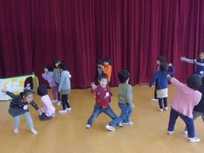 4歳児が遊戯室で「こおっちゃう」の歌にのって楽しく遊んでいます。凍ってしまうポーズはみんな自分たちでいろいろと考え、工夫をして決めています。