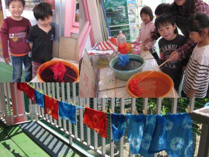 5歳児(ゆり組)が「母の日」のプレゼントとして、昨日洗濯したハンカチを絞り染めにしました。青やオレンジの絞りがあざやかに出来上がりました。染め上がってくる様子を見てその美しさにとても感心していました。