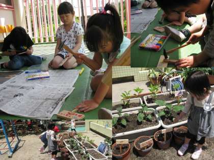 ゆり組(5歳児)が木切れに絵や名前などをかいて、ひまわりの鉢につけていました。初めてかなづちを使って、釘を打っていました。慎重に丁寧に打ち付けていました。
