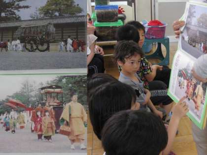 ゆり組(5歳児)は明日葵まつりの見学に行きます。今日は見学の前に先生から葵まつりについてのお話を聞きました。担任が子どもたちが京都の伝統行事に興味が持てるよう,斎王代の写真や牛車の写真などを見せて,昔の平安時代の衣装などについても話をしていました。明日の見学が楽しみですね。