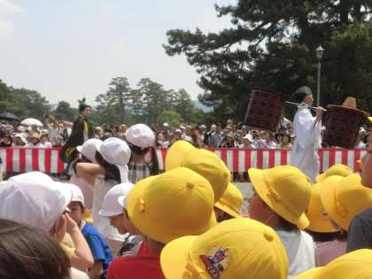 子どもたちは,地下鉄東西線に乗って,「京都御苑で三つ目の駅なんや・・近いな・・」と驚きながら京都御苑に到着。みんなは昨日,先生から聞いた斎王代さんを見るのを楽しみにしていました。斎王代さんが出てきたときには、「うわー、きれい」と大喜びでした。御苑からの帰り道に「葵祭りで何が良かった?」と聞くと「お姫さんがきれいだった」と斎王代さんのことはもちろん,「牛がな・・・黒くてピカピカやった・・角もきれいやったで」とよくみていたらしく,自分のお気に入りを見つけたようでした。こうした京都ならでは伝統行事に触れる機会は,大人になっても心に残っていくのではないかなと思いました。