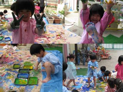 担任は子どもたちに絵の具で思いきり遊んでほしいと,昨日遅くまで絵の具の用意(実はこの絵の具には感触を良くするためと洗って落ちやすいようにのりが入っています)や紙を張り合わせて大きな用紙を作りました。子どもたちは暑いくらいの好天気に恵まれ,絵の具を混ぜて、きれいな色ができたことを楽しみました。手や足、ローラーなどを使って紙に塗り、感触や色を楽しみました。