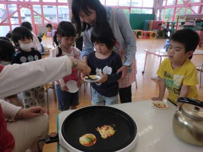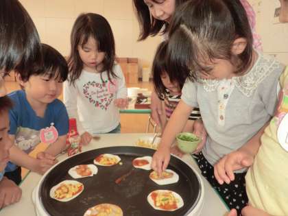 今日の預り保育のおやつは,ピザを作ってみました。チーズ,コーン,ピーマン,トマトをトッピングしました。簡単でおいしいので,子どもたちも「おうちでもつくる!」と大喜びでした。苦手なピーマンもちょっと食べられるようになったようです。その後はお友達と好きなおもちゃで遊びました。