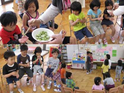 今,幼稚園にはえんどう豆のほかに5歳児が育てたそら豆もできています。大きくなったそら豆をそーっと中身を開いてみてみました。ふわふわの白いさやの中に5粒のえんどう豆がぷっくらと寝ていました。「わー大きい豆やな」と子どもたちは大感激!早速湯がいて食べました。採れたてのそら豆はやわらかく甘かったです。ゆり組(5歳児)が幼稚園に遊びに来ていたいちご組にも,そら豆をとどけてご馳走しました。