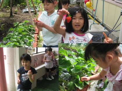 幼稚園の花壇で育てているいちごに真っ赤なおおきな実がなりました。スーパーやお店でパックに入っているいちごとは一味違う,摘んですぐのいちごを食べました。食べてみるとちょっぴりすっぱいものもありましたが、とってもおいしかったです。これからどんどん赤くなるね・・・。