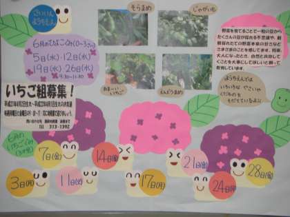西院幼稚園では門の横にいちご組・ひよこ組の予定を貼りだしています。今月はこんな素敵な掲示板です。